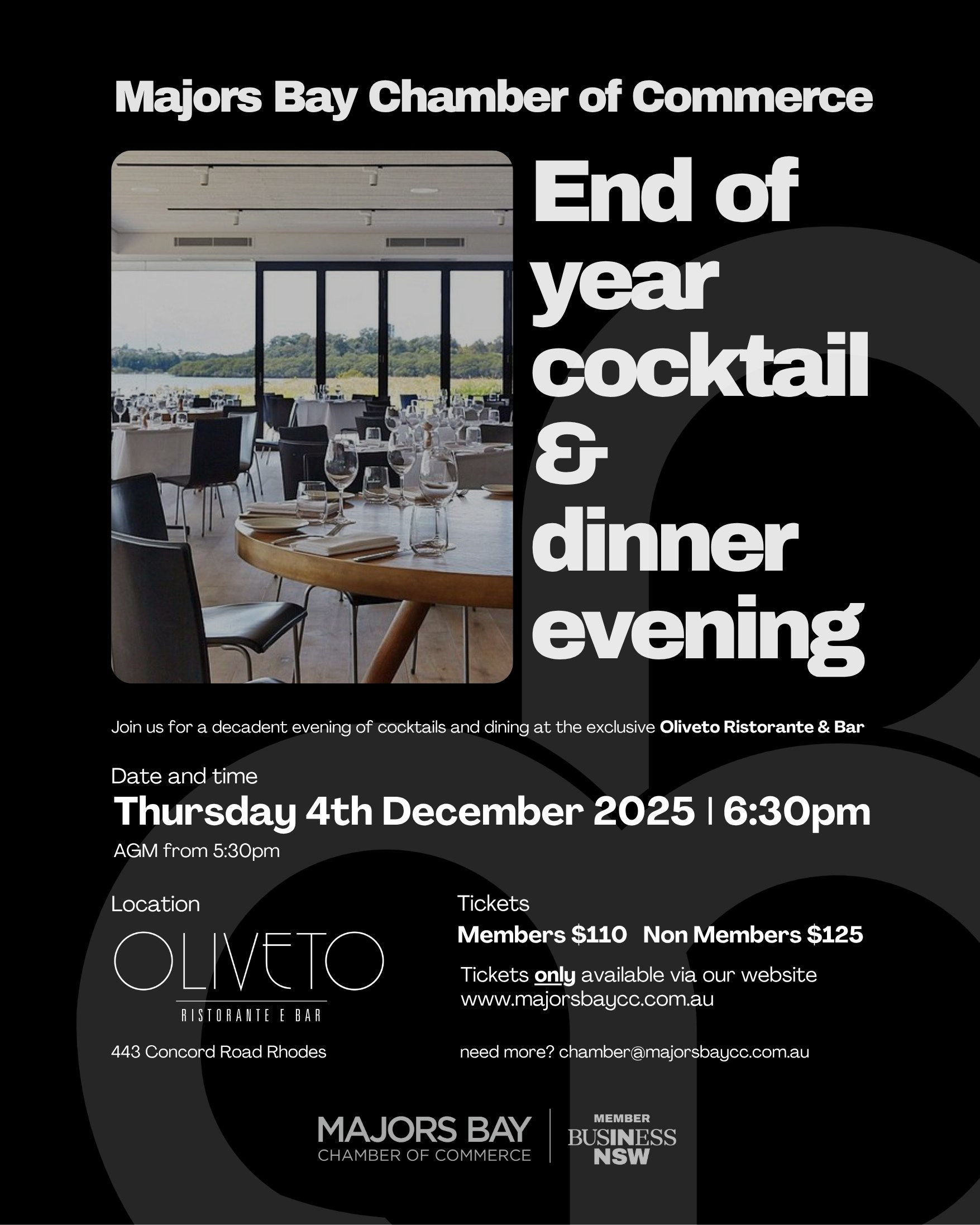 "The Majors Bay Chamber of Commerce, established in 1993, is the local representative group for businesses inConcord, Breakfast Point, Cabarita, Mortlake and North Strathfield area within the Local Government Area of The City of Canada Bay.
